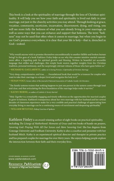 This book is a look at the spirituality of marriage through the lens of Christian spirituality. It will help you see how your faith and spirituality is lived out daily in your marriage, not just in the churchy activities you may attend. Through looking at grace, vocation, community, asceticism, incarnation, discernment, dying, and rising, you will see more fully the holiness of what you are already living in your marriage, as well as some ways that you can enhance and support that holiness. The term ""holiness"" may not be used that often when it comes to marriage, but when you begin to see God's presence everywhere, it is clear that your life is holy--that is, drenched in God--indeed.