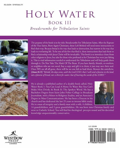 The purpose of the book is in the title; Breadcrumbs For Tribulation Saints. After the Rapture of the True Saints, Born Again Christians, those Left Behind will need some instructions to find their way. Because broad is the way that leads to destruction, but narrow is the way that leads to everlasting life. To be one of the few that find it, these instructions that lead them to find a relationship with Jesus Christ will be invaluable. This book is to introduce those from other religions to Jesus, but also for those who professed to be Christians but were just faking it. This is vital information needed to understand the Tribulation and will help guide them through it. Do Not Take The Mark Of The Beast. If you have family, friends, co-workers, or neighbors who are not saved, buy a copy and gift it to them; it just may save their soul. Once WE are all gone, there will be no one left to lead them. Beware the antichrist. [Amos 8:11] "Behold, the days come, saith the Lord GOD, that I will send a famine in the land, not a famine of bread, nor a thirst for water, but of hearing the words of the LORD:"