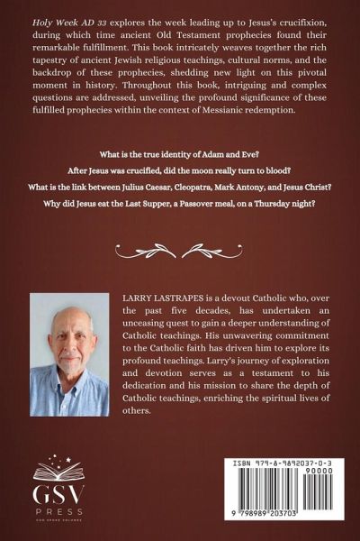 Holy Week AD 33 explores the week leading up to Jesus's crucifixion, during which time ancient Old Testament prophecies found their remarkable fulfillment. This book intricately weaves together the rich tapestry of ancient Jewish religious teachings, cultural norms, and the backdrop of these prophecies, shedding new light on this pivotal moment in history. Throughout this book, intriguing and complex questions are addressed, unveiling the profound significance of these fulfilled prophecies within the context of Messianic redemption. Why did Jesus eat the Last Supper, a Passover meal, on a Thursday night? What is the true identity of Adam and Eve? What is the link between Julius Caesar, Cleopatra, Mark Antony, and Jesus Christ? After Jesus was crucified, did the moon really turn to blood?