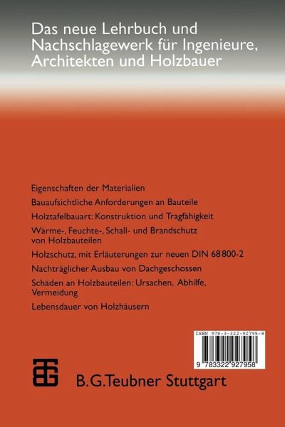 1 Vorbemerkungen.- 1.1 Zielsetzung.- 1.2 Leserkreis.- 1.3 Inhalt.- 1.4 Vorschriften.- 1.5 Der Autor.- 2 Stoffe.- 2.1 Allgemeines.- 2.2 Vollholz.- 2.3 Brettschichtholz.- 2.4 Holzwerkstoffe.- 2.5 Gipsbauplatten.- 2.6 Wärmedämmstoffe.- 2.7 Sonstige Materialien.- 3 Anforderungen und Nachweise.- 3.1 Übersicht.- 3.2 Tragfähigkeit.- 3.3 Wärmeschutz.- 3.4 Tauwasserschutz.- 3.5 Schallschutz.- 3.6 Brandschutz.- 3.7 Vorbeugender Holzschutz; Anforderungen.- 4 Wände in Holztafelbauart.- 4.1 Allgemeines.- 4.2 Anforderungen.- 4.3 Berechnungsgrundlagen.- 4.4 Nachweis der Tragfähigkeit von Wandtafeln.- 4.5 Wandscheiben.- 4.6 Beispiel für Bemessung einer Wandscheibe als Verbundquerschnitt.- 4.7 Beispiel für vereinfachte Bemessung ohne Berücksichtigung des Verbunds.- 4.8 Statische Typenberechnung für Wandtafeln.- 4.9 Wandscheiben mit allgemeiner bauaufsichtlicher Zulassung.- 4.10 Tragfähigkeits-Tabellen für Wandscheiben.- 4.11 Verankerung von Wandtafeln.- 4.12 Wandscheiben in mehrgeschossigen Gebäuden.- 5 Decken und Dächer in Holztafelbauart.- 5.1 Allgemeines.- 5.2 Mitwirkende Beplankungsbreite.- 5.3 Beplankungsstöße.- 5.4 Rippenabstände.- 5.5 Querschnittswerte von Tafeln.- 5.6 Durchbiegung.- 5.7 Beispiel für Bemessung einer Flachdach-Tafel.- 5.8 Decken- und Dachscheiben.- 6 Dach- und Deckenschalungen.- 6.1 Allgemeines.- 6.2 Bemessung.- 6.3 Erforderliche Mindestdicken für Dachschalungen aus Spanplatten.- 6.4 Scheiben aus Holzwerkstoffen.- 7 Außenwände.- 7.1 Konstruktionsprinzipien.- 7.2 Tragfähigkeit.- 7.3 Baulicher und chemischer Holzschutz.- 7.4 Wärmeschutz.- 7.5 Feuchteschutz.- 7.6 Schallschutz.- 7.7 Brandschutz.- 7.8 Gebäudetrennwände.- 8 Geneigte Dächer.- 8.1 Konstruktionsprinzipien.- 8.2 Baulicher und chemischer Holzschutz (Ubersicht).- 8.3 Belüftetesoder nicht belüftetes Dach.- 8.4 Belüftetes Dach.- 8.5 Nicht belüftetes Dach.- 8.6 Wärmeschutz von nicht belüfteten Dächern.- 8.7 Schallschutz.- 8.8 Brandschutz.- 9 Flachdächer.- 9.1 Konstruktionsprinzipien und Merkmale.- 9.2 Belüfteter oder nicht belüfteter Querschnitt.- 9.3 Holzschutz.- 9.4 Wärmeschutz.- 9.5 Feuchteschutz.- 9.6 Schallschutz.- 9.7 Brandschutz.- 10 Innenwände.- 10.1 Allgemeines.- 10.2 Holzschutz.- 10.3 Schallschutz.- 10.4 Resultierende Schalldämmung.- 10.5 Brandschutz.- 11 Geschoßdecken.- 11.1 Anwendungsbereiche.- 11.2 Konstruktionsprinzipien.- 11.3 Wärmeschutz.- 11.4 Feuchteschutz und Holzschutz.- 11.5 Schallschutz, Allgemeines.- 11.6 Schalldämmung von Holzdecken in Holzhäusern.- 11.7 Luftschalldämmung von Holzdecken in Massivgebäuden.- 11.8 Brandschutz.- 11.9 Unterböden mit Fliesenbelag in Naßbereichen.- 12 Decken unter nicht ausgebauten Dachgeschossen.- 12.1 Übersicht.- 12.2 Feuchteschutz und Holzschutz.- 12.3 Schallschutz.- 12.4 Brandschutz.- 13 Nichttragende Innenwände.- 13.1 Vorbemerkungen.- 13.2 Standsicherheit.- 13.3 Ausbildung der Wände.- 13.4 Konstruktionen mit nachgewiesener Standsicherheit.- 13.5 Brandschutz.- 13.6 Freistehende biegeweiche Vorsatzschalen.- 13.7 Trennwände in Naßbereichen von Wohngebäuden.- 14 Nachträglicher Ausbau von Dachgeschossen.- 14.1 Allgemeines.- 14.2 Bauaufsichtliche Anforderungen.- 14.3 Dachkonstruktion und Nachweise.- 14.4 Holzbalkendecken unter Dachgeschossen und Nachweise.- 15 Feuchtebedingte Schäden an Holzbauteilen, Abhilfe und Vermeidung.- 15.1 Vorbemerkung.- 15.2 Auswirkungen unzulässiger Feuchte auf die Baustoffe.- 15.3 Geneigte Dächer.- 15.4 Flachdächer.- 15.5 Decken unter nicht ausgebauten Dachgeschossen.- 15.6 Geschoßdecken.- 15.7 Außenwände.- 15.8 Außen- undInnenwände.- 16 Lebensdauer von Holzhäusern.- 16.1 Allgemeines.- 16.2 Erstellung der Gebäude, Voraussetzungen.- 16.3 Nutzung der Gebäude.- 16.4 Spätere Änderungen der Konstruktion oder der Gebäudetechnik.- 16.5 Grundlagen für die Beurteilung der Konstruktion.- 16.6 Bauteile.- 16.7 Lebensdauer von Holzhäusern.- Literatur.- Zitierte Vorschriften.