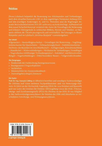 Allgemeines.- Baustoffeigenschaften.- Grundlagen der Bemessung.- Tragfähigkeitsnachweise für Querschnitte.- Gebrauchstauglichkeit.- Stabilitätsnachweise.- Nachweis von Bauteilen im Anschlussbereich.- Auflagerungen, Kontaktanschlüsse.- Hausdächer.- Klebeverbindungen.- Mechanische Verbindungen, Grundlagen.- Tragverhalten stiftförmiger Verbindungsmittel.- Stabdübel- und Bolzenverbindungen.- Nagelverbindungen.- Dübel besonderer Bauart.- Vollgewindeschrauben.