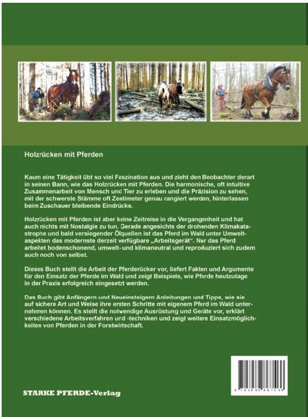 Kaum eine Tätigkeit übt so viel Faszination aus und zieht den Beobachter derart in seinen Bann wie das Holzrücken mit Pferden. Die harmonische, oft intuitive Zusammenarbeit von Mensch und Tier zu erleben und die Präzision zu sehen, mit der schwerste Stämme oft Zentimeter genau rangiert werden, hinterlassen beim Zuschauer bleibende Eindrücke. Holzrücken mit Pferden ist aber keine Zeitreise in die Vergangenheit und hat auch nichts mit Nostalgie zu tun. Gerade angesichts der drohenden Klimakatastrophe und bald versiegender Ölquellen ist das Pferd im Wald unter Umweltaspekten das modernste derzeit verfügbare "Arbeitsgerät". Nur das Pferd arbeitet bodenschonend, umwelt- und klimaneutral und reproduziert sich zudem auch noch selbst. Dieses Buch stellt die Arbeit der Pferderücker vor, liefert Fakten und Argumente für den Einsatz der Pferde im Wald und zeigt Beispiele, wie Pferde heutzutage in der Praxis erfolgreich eingesetzt werden. Das Buch gibt Anfängern und Neueinsteigern Anleitungen und Tips, wie sie auf sichere Art und Weise ihre ersten Schritte mit dem eigenen Pferd im Wald unternehmen können. Es stellt die notwendige Ausrüstung und Geräte vor, erklärt verschiedene Arbeitsverfahren und -techniken und zeigt weitere Einsatzmöglichkeiten von Pferden in der Forstwirtschaft.