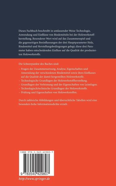Dieses Fachbuch beschreibt in umfassender Weise Technologie, Anwendung und Einflüsse von Bindemitteln bei der Holzwerkstoffherstellung. Besonderer Wert wird auf das Zusammenspiel und die gegenseitigen Beeinflussungen der drei Hauptparameter Holz, Bindemittel und Herstellungsbedingungen gelegt; diese drei Parameter haben entscheidenden Einfluß auf die Qualität der produzierten Holzwerkstoffe. Die Schwerpunkte des Buches sind: