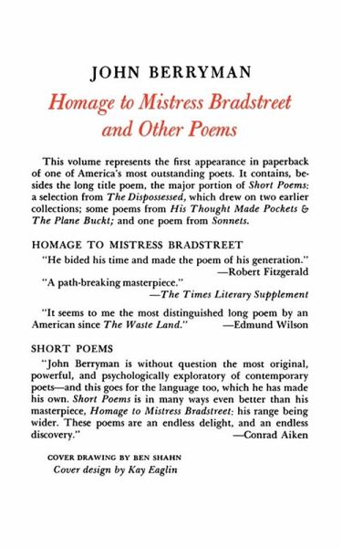 This volume represents the first appearance in paperback of one of America's most outstanding poets, John Berryman. It contains, besides the long title poem, Homage to Mistress Bradstreet, the major portion of Short Poems; a selection from The Dispossessed, which drew on two earlier collections; some poems from His Thought Made Pockets & The Plane Buckt; and one poem from Sonnets. "It seems to me the most distinguished long poem by an American since The Waste Land." - Edmund Wilson