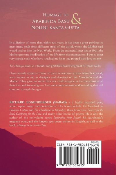 In a lifetime of more than eighty-two years, it has been a great privilege to meet many souls from different areas of the world, whom the Mother said would lead us into the New World. From the moment I met her in 1961, the Mother gave me the direction of my life; from that moment on, I was to meet very special souls who have touched my heart and poured their love on me. The Homages series is a tribute and grateful acknowledgment of those souls. I have already written of many of these in extensive articles. Many, but not all, were known to me as disciples and devotees of Sri Aurobindo and the Mother. They gave me more than one could imagine in the transmission of their love and knowledge-a love and compassionate understanding that will continue through the ages.