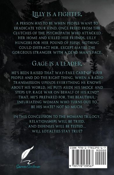 Lilly is a fighter. A person has to be when people want to eradicate your kind. Once freed from the clutches of the psychopath who attacked her home and killed her friends, Lilly hungers for her pound of flesh. Nothing could distract her, except maybe the gorgeous stranger with a dead man's face. Gage is a leader. He's been raised that way-take care of your people and do the right thing. When a radio transmission upends everything he knows about his world, he puts aside his shock and steps up. Rage war on behalf of his kind? That, he's prepared for. The beautiful, infuriating woman who turns out to be his mate? Not so much. In this conclusion to the Homani trilogy, relationships will be tried, and defenses will be tested... Will loyalties stay true?