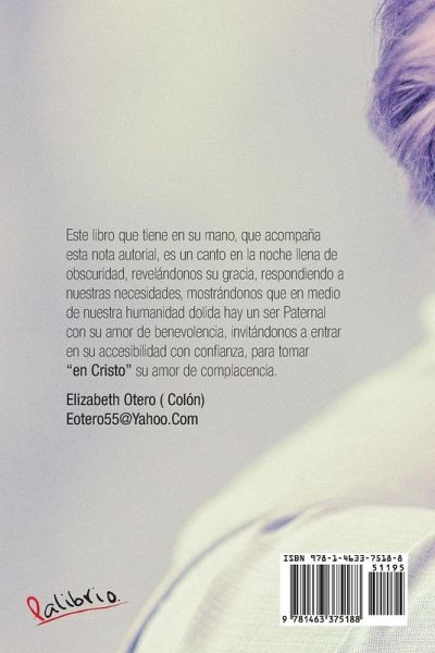 Este libro que tiene en su mano, que acompaña esta nota autorial, es un canto en la noche llena de obscuridad, revelándonos su gracia, respondiendo a nuestras necesidades, mostrándonos que en medio de nuestra humanidad dolida hay un ser Paternal con su amor de benevolencia, invitándonos a entrar en su accesibilidad con confianza, para tomar "en Cristo" su amor de complacencia. Elizabeth Otero ( Colón) Eotero55@Yahoo.Com