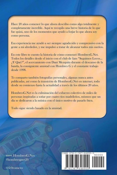En este libro te cuento la historia de cómo comenzó HombresG.Net. Todos los detalles desde el inicio con el club de fans "Seguimos Locos... ¿Y Qué?", el acercamiento con Dani Mezquita durante el descanso de la banda, la consiguiente amistad con Hombres G y el constante trabajo desde 1998.