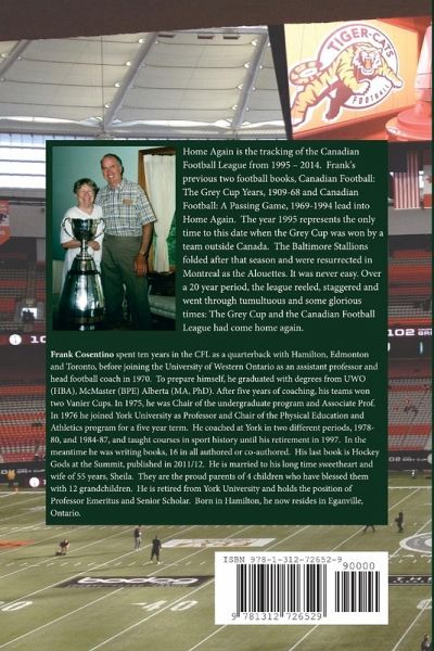 Home Again is the tracking of the Canadian Football League from 1995 - 2014. The year 1995 represents the only time to this date when the Grey Cup was won by a team outside Canada. The Baltimore Stallions folded after that season and were resurrected in Montreal as the Alouettes. It was never easy. Over a 20 year period, the league reeled, staggered and went through tumultuous and some glorious times: The Grey Cup and the Canadian Football League had come home again.