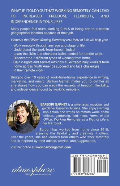 What if I told you that working remotely can lead to increased freedom, flexibility, and independence in your life? Many people feel stuck working 9-to-5 or being tied to a certain geographical location because of their job. Home at the Office: Working Remotely as a Way of Life will help you: · Work remotely through any age and stage of life · Understand the work-from-home mindset · Learn the skills and character traits needed for remote work · Discover the 7 different types of working from home · Gain insights and secrets into how 10 extraordinary workers from home across North America succeed and face challenges in their remote work Bringing over 10 years of work-from-home experience in writing, marketing, and music, Barbori Garnet invites you to join her as she shares how you can enjoy the rewards of freedom, flexibility, and independence found by working remotely.