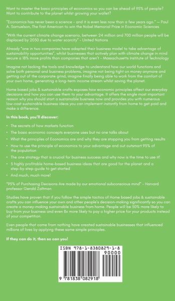 Everything you need to know to stay ahead in today's ever-changing, fast-paced economic turmoil... Times are changing, and they are changing fast - the only question is, "Are you ready?" Consider the following: Are you sick and tired of the same mundane work and lifestyle day after day, wanting to take it to the next level by starting your own business and becoming financially independent?Would you like to start this business in the most in-demand niche of the time, guaranteeing you room for exponential growth and profit?Are you ready to tackle larger-level problems, like our current climate crisis? If you're answering 'yes' to these questions, then it's time for you to break free and branch out into a whole new reality - one where you manage your own business and do your part to help save the planet. The current economy is primed and ready, and now is the best possible time to start a sustainable business. In fact, 48% of U.S. consumers say they would change their consumption habits to reduce their impact on the environment. With a basic understanding of economic principles, you can begin your own business in no time. And by having the right mindset, as well as the proper tools and techniques, your new business idea could be the next big thing that changes the world. In Home-Based Jobs & Sustainable Crafts, you'll discover: The basic principles of economics and how to use them to your advantageHow to outsmart 99% of the competition by using scientifically proven strategies for successWhy working remotely is the best way to start your sustainable business, and how to do itThe secrets of macroeconomics and how to utilize the income of nations to push your business forwardGroundbreaking insight into recycling and upcycling material that will gain you profitA step-by-step guide to starting your own business from home, even if you don't have any prior experience5 of the best business ideas in sustainability for the upcoming decade ... and so much more. Generating success for yourself in everyday life doesn't have to be a big scary thing. Feeling constricted by your current situation is something you can change. The best business success doesn't always come from the rich and famous. Actually, it usually comes from someone just like you - someone with passion and desire who is ready to leave an impact on the world. If you're ready to earn a living from the comfort of your own home while helping the planet at the same time, then start reading right now.