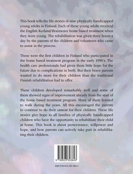 This book tells the life stories of nine physically handicapped young adults in Finland. Each of these young adults received the English Kerland/Brainwave home-based treatment when they were young. The rehabilitation was given three hours a day by the parents of the children and volunteers who came to assist in the process. These were the first children in Finland who participated in the home-based treatment program in the early 1990's. The health care professionals had given them little hope for the future due to complications in birth. But their brave parents wanted to do more for their children than the traditional Finnish rehabilitation had to offer. These children developed remarkably well and some of them showed signs of improvement already from the start of the home-based treatment program. Many of them learned to walk during the years. All this encouraged the parents to continue to do their utmost for their children. These life stories give hope to all families of physically handicapped children who have the opportunity to rehabilitate their child at home. This book is about perseverance, willpower and hope, and how parents can actively take part in rehabilitating their children.