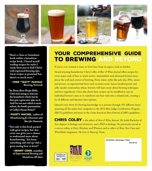 Your Comprehensive Guide to Brewing and Beyond If you've ever wanted to learn to brew beer from an expert, look no further. Award-winning homebrewer Chris Colby of Beer & Wine Journal offers recipes for every major style of beer to teach novice, intermediate and advanced brewers more about the craft and science of brewing. From classic styles like pale ales, IPAs, stouts and porters, to experimental beers such as oyster stout, bacon-smoked porter and jolly rancher watermelon wheat, brewers will learn more about brewing techniques and beer ingredients. Chris also shows how recipes can be modified to suit an individual brewer's taste or to transform one beer style into a related style, creating a lot of different and fantastic beer options. Quench your thirst for brewing knowledge on a journey through 101 different beers, spanning all the major beer categories in the 2016 Beer Judge Certification Program (BJCP) guidelines and most in the Great American Beer Festival (GABF) guidelines.