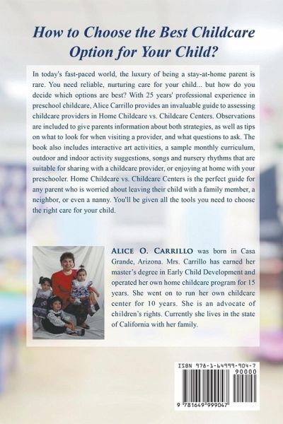 How to Choose the Best Childcare Option for Your Child? In today's fast-paced world, the luxury of being a stay-at-home parent is rare. You need reliable, nurturing care for your child... but how do you decide which options are best? With 25 years' professional experience in preschool childcare, Alice Carrillo provides an invaluable guide to assessing childcare providers in Home Childcare vs. Childcare Centers. Observations are included to give parents information about both strategies, as well as tips on what to look for when visiting a provider, and what questions to ask. The book also includes interactive art activities, a sample monthly curriculum, outdoor and indoor activity suggestions, songs and nursery rhythms that are suitable for sharing with a childcare provider, or enjoying at home with your preschooler. Home Childcare vs. Childcare Centers is the perfect guide for any parent who is worried about leaving their child with a family member, a neighbor, or even a nanny. You'll be given all the tools you need to choose the right care for your child.