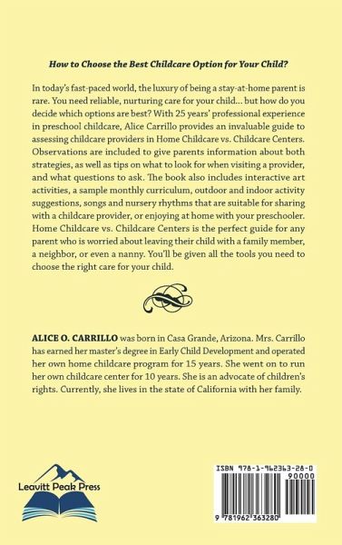 How to Choose the Best Childcare Option for Your Child? In today's fast-paced world, the luxury of being a stay-at-home parent is rare. You need reliable, nurturing care for your child... but how do you decide which options are best? With 25 years' professional experience in preschool childcare, Alice Carrillo provides an invaluable guide to assessing childcare providers in Home Childcare vs. Childcare Centers. Observations are included to give parents information about both strategies, as well as tips on what to look for when visiting a provider, and what questions to ask. The book also includes interactive art activities, a sample monthly curriculum, outdoor and indoor activity suggestions, songs and nursery rhythms that are suitable for sharing with a childcare provider, or enjoying at home with your preschooler. Home Childcare vs. Childcare Centers is the perfect guide for any parent who is worried about leaving their child with a family member, a neighbor, or even a nanny. You'll be given all the tools you need to choose the right care for your child.