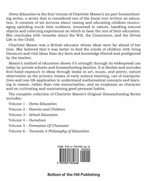 Home Education is the first volume of Charlotte Mason's six part homeschooling series, a series that is considered one of the finest ever written on education. It consists of six lectures about raising and educating children encouraging spending much time outdoors, immersed in nature, handling natural objects and collecting experiences on which to base the rest of their education. She concludes with remarks about the Will, the Conscience, and the Divine Life in the Child. Charlotte Mason was a British educator whose ideas were far ahead of her time. She believed that it was better to feed the minds of children with living literature and vital ideas than dry facts and knowledge filtered and predigested by the teacher. Mason's method of education shows it's strength through its widespread use today by private schools and homeschooling families. It is flexible and includes first-hand exposure to ideas through books in art, music, and poetry, nature observation as the primary means of early science teaching, use of manipulatives and real-life application to understand mathematical concepts and learning to reason, rather than rote memorization, and an emphasis on character and on cultivating and maintaining good personal habits. The complete collection of Charlotte Mason's Original Homeschooling Series includes: Volume 1 - Home Education Volume 2 - Parents and Children Volume 3 - School Education Volume 4 - Ourselves Volume 5 - Formation Of Character Volume 6 - Towards A Philosophy of Education