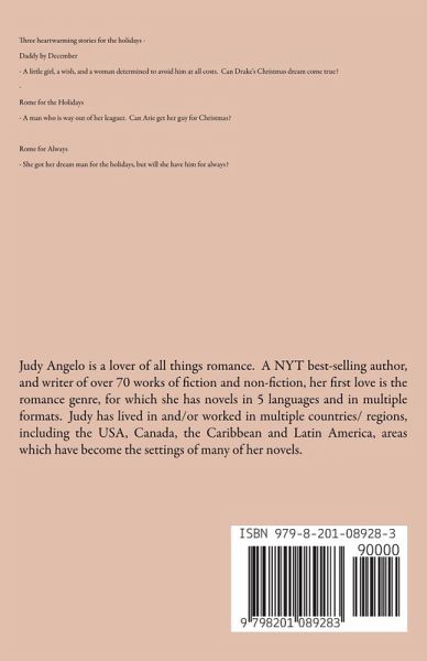 DADDY BY DECEMBER A little girl, a wish, and a woman determined to stay out of his reach. How to reconcile the three? Billionaire investor, Drake Duncan, is at the top of his game. He decides to hire a ghostwriter to work on his memoir. Little does he know that the writer who will answer the call is truly a ghost - from his past. Meg Gracey is the proverbial 'starving artist', a writer down on her luck. When she is offered a contract as ghostwriter she jumps at the chance, only to later realize that the job will throw her directly in the path of the man she vowed never to 'touch with a long stick'. Caught between starvation and emotional torture she is forced to choose. Does she follow reason or give in to the desires of her heart? ROME FOR THE HOLIDAYS Talk about sexy as sin... Arie Angelis is floored when she lays eyes on the handsome hunk seated at the head table at the holiday event she's catering. She literally can't take her eyes off him. She's always prided herself on being the consummate professional, but not this time. But, attracted or not, when she finds out who he is she realizes he's way out of her reach. But you can't stop a girl from dreaming... Rome Milano is used to getting what he wants but when he meets the hot and heavenly Arie Angelis he learns that he can't always have his way. He's used to calling the shots but, if the lady has her way, not this time... ROME FOR ALWAYS Arie Angelis is on top of the world. She's engaged to the man of her dreams, the super-handsome and successful CEO of Belitalia, Rome Milano. She could not believe it when he proposed on Christmas Day. Of course, she said yes! But then, only a month into their engagement there's a turn of events that threatens to steal her newfound happiness. In the past she'd made a life-altering choice. Now it's time to stand by that decision. The only question is, will Rome stand with her or will it send him running? Rome Milano knows a good thing when he sees it and when he meets Arie he has no doubt that she's the one for him. He falls so swiftly in love with her that within weeks of meeting her he's proposing. He can't be any happier when she accepts. But there's just one problem - how to convince the important people in his life that this is for real. Now that he's found happiness will he be forced to choose between love and loyalty? It's decision time on both sides. Through it all, will love prevail?