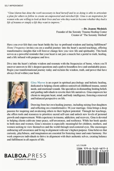 Have you ever sensed that your heart holds the key to profound wisdom and deep fulfi llment? In "Home Frequency," embark on a soul-stirring exploration of the heart's profound teachings. This book is your guide to unlocking the boundless wisdom that resides within, off ering insights that will forever change your perspective on life and spirituality. With each Page, you'll journey deeper into the heart's sacred realm, discovering timeless lessons that resonate with your very soul. "Home Frequency" is a powerful reminder that your heart is not just a muscle; it's a portal to profound truths, healing, and a life imbued with purpose and love. Dive into the heart's infi nite wisdom and resonate with frequencies of home, where you'll fi nd the answers to life's deepest questions and a path to a life fi lled with boundless love and shakable peace. Begin your transformation journey today and rediscover the wisdom that has always been beating within your heart, In loving gratitude, Gina xo