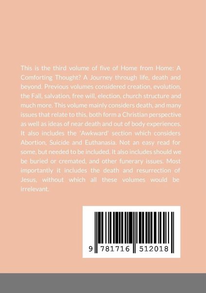 This is the third volume of five of Home from Home: A Comforting Thought? A Journey through life, death and beyond. Previous volumes considered creation, evolution, the Fall, salvation, free will, election, church structure and much more. This volume mainly considers death, and many issues that relate to this, both form a Christian perspective as well as ideas of near death and out of body experiences. It also includes the 'Awkward' section which considers Abortion, Suicide and Euthanasia. Not an easy read for some, but needed to be included. It also includes should we be buried or cremated, and other funerary issues. Most importantly it includes the death and resurrection of Jesus, without which all these volumes would be irrelevant.