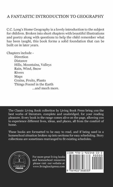 C.C. Long's Home Geography is a lovely introduction to the subject for children. Broken into short chapters with beautiful illustrations and poetry along with questions to help the child remember what has been taught, this book forms a solid foundation that can be built on in later years. Chapters include - Direction Distance Hills, Mountains, Valleys Rain, Wind, Snow Rivers Maps Grains, Fruits, Plants Things Found in the Earth ...and much more.