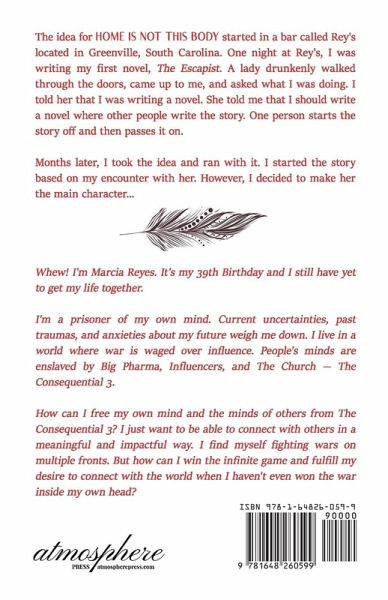 The idea for Home Is Not This Body started in a bar called Rey's located in Greenville, South Carolina. One night at Rey's, I was writing my first novel, The Escapist. A lady drunkenly walked through the doors, came up to me, and asked what I was doing. I told her that I was writing a novel. She told me that I should write a novel where other people write the story. One person starts the story off and then passes it on. Months later, I took the idea and ran with it. I started the story based on my encounter with her. However, I decided to make her the main character... Whew! I'm Marcia Reyes. It's my 37th Birthday and I still have yet to get my life together. I'm a prisoner of my own mind. Current uncertainties, past traumas, and anxieties about my future weigh me down. I live in a world where war is waged over influence. People's minds are enslaved by Big Pharma, Influencers, and The Church - The Consequential 3. How can I free my own mind and the minds of others from The Consequential 3? I just want to be able to connect with others in a meaningful and impactful way. I find myself fighting wars on multiple fronts. But how can I win the infinite game and fulfill my desire to connect with the world when I haven't even won the war inside my own head?