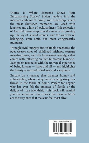 "Home Is Where Everyone Knows Your Embarrassing Stories" invites readers into the intimate embrace of family and friendship, where the most cherished memories are laced with laughter and a hint of awkwardness. This collection of heartfelt poems captures the essence of growing up, the joy of shared secrets, and the warmth of belonging, even amid our most cringeworthy moments. Through vivid imagery and relatable anecdotes, the poet weaves tales of childhood mishaps, teenage misadventures, and the bittersweet nostalgia that comes with reflecting on life's humorous blunders. Each poem resonates with the universal experience of being known - flaws and all - and highlights the beauty of unconditional love and acceptance. Embark on a journey that balances humor and vulnerability, where every embarrassing story is a thread in the fabric of home. Perfect for anyone who has ever felt the embrace of family or the delight of true friendship, this book will remind you that sometimes the stories that make us blush are the very ones that make us feel most alive.