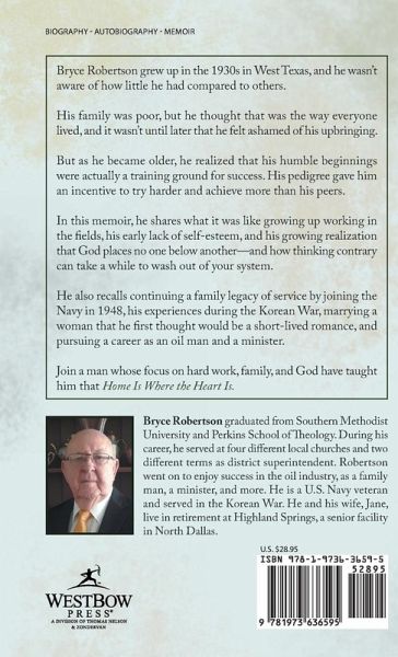 Bryce Robertson grew up in the 1930s in West Texas, and he wasn't aware of how little he had compared to others. His family was poor, but he thought that was the way everyone lived, and it wasn't until later that he felt ashamed of his upbringing. But as he became older, he realized that his humble beginnings were actually a training ground for success. His pedigree gave him an incentive to try harder and achieve more than his peers. In this memoir, he shares what it was like growing up working in the fields, his early lack of self-esteem, and his growing realization that God places no one below another-and how thinking contrary can take a while to wash out of your system. He also recalls continuing a family legacy of service by joining the Navy in 1948, his experiences during the Korean War, marrying a woman that he first thought would be a short-lived romance, and pursuing a career as an oil man and a minister. Join a man whose focus on hard work, family, and God have taught him that Home Is Where the Heart Is.