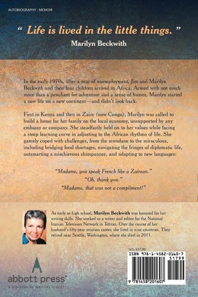"Life is lived in the little things." -Marilyn Beckwith In the early 1970s, after a year of unemployment, Marilyn Beckwith was in desperate need for change in her life. With her characteristic joie de vivre, she started a new life on a new continent-and didn't look back. In 1971, she and her husband moved to Africa with their four children, armed with not much more than a penchant for adventure and a sense of humor. They started their African adventures in Kenya, and they tried life in Zaire (now Congo). Marilyn was called to build a home for her family on the local economy, unsupported by any embassy or company. While steadfastly holding on to her values, she faced a steep learning curve in adjusting to the African rhythms of life. She gamely coped with challenges, from the mundane to the miraculous, including bridging food shortages, navigating the fringes of diplomatic life, outsmarting a mischievous chimpanzee, and adapting to new languages: "Madame, you speak French like a Zairean." "Oh, thank you." "Madame, that was not a compliment!" Journey with this American mother as she discovers that everyday life can become extraordinarily entertaining when circumstances are unusual.