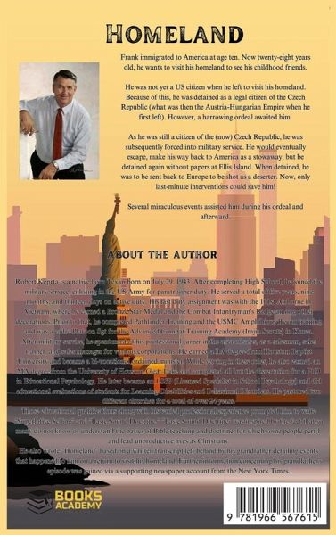 SUMMARY Frank immigrated to America at age ten. Now twenty-eight years old, he wants to visit his homeland to see his childhood friends. He was not yet a US citizen when he left to visit his homeland. Because of this, he was detained as a legal citizen of the Czech Republic (what was then the Austria-Hungarian Empire when he first left). However, a harrowing ordeal awaited him. As he was still a citizen of the (now) Czech Republic, he was subsequently forced into military service. He would eventually escape, make his way back to America as a stowaway, but be detained again without papers at Ellis Island. When detained, he was to be sent back to Europe to be shot as a deserter. Now, only last-minute interventions could save him! Several miraculous events assisted him during his ordeal and afterward. About the author Robert Keprta is a native born Texan born on July 29, 1943. After completing High School, he joined the military service, enlisting in the US Army for paratrooper duty. He served a total of five years, nine months, and thirteen days on active duty, His last duty assignment was with the 101st Airborne in Vietnam, where he earned a Bronze Star Medal and the Combat Infantryman's Badge among other decorations. Prior to that, he completed Pathfinder Training and the USMC Amphibious Recon training and was a cadre Platoon Sgt for the Advanced Combat Training Academy (Imjin Scouts) in Korea.