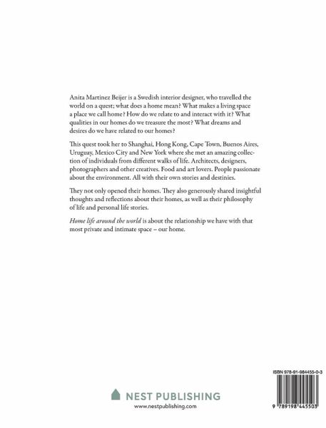 Home Life Around the World is about the relationship we have with that most private and intimate space – our home. Step into personal homes of architects, designers, photographers and other creatives. Food and art lovers. People passionate about the environment. All with their own stories and destinies. The homes are located in Shanghai, Hong Kong, Cape Town, Buenos Aires, Uruguay, Mexico City and New York. Richly illustrated with inspiring and honest photos of the home environment of these individuals, whose personality colour every image of the book. With personal and interesting texts based on interviews with the homeowners, who generously shared insightful thoughts and reflections about themselves and their homes, as well as their philosophy of life and their personal life stories. Anita Martinez Beijer is a Swedish author, photographer and interior designer, who travelled the world on a quest; what does a home mean? What makes a living space a place we call home? How do we relate to and interact with it? What qualities in our homes do we treasure the most? What dreams and desires do we have related to our homes?