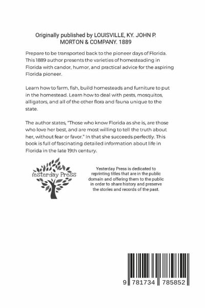 Originally published by LOUISVILLE, KY. JOHN P. MORTON & COMPANY. 1889 Prepare to be transported back to the pioneer days of Florida. This 1889 author presents the varieties of homesteading in Florida with candor, humor, and practical advice for the aspiring Florida pioneer. Learn how to farm, fish, build homesteads and furniture to put in the homestead. Learn how to deal with pests, mosquitos, alligators, and all of the other flora and fauna unique to the state. The author states, "Those who know Florida as she is, are those who love her best, and are most willing to tell the truth about her, without fear or favor." In that she succeeds perfectly. This book is full of fascinating detailed information about life in Florida in the late 19th century. Yesterday Press is dedicated to reprinting titles that are in the public domain and offering them to the public in order to share history and preserve the stories and records of the past. All reprints are carefully matched against the originals and with the exception of minor font and formatting changes to fit the current day, all spellings, paragraph breaks, chapter headings, etc. are preserved from the original. From the original book (1889): "It is not well to venture into unknown regions blindfold, as it were. That sound old admonition to "Look before you leap" is full of good common sense, and yet it is passed by unheeded more frequently than one can well realize.