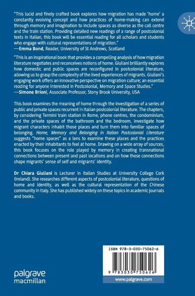 This book examines the meaning of home through the investigation of a series of public and private spaces recurrent in Italian postcolonial literature. The chapters, by respectively considering Termini train station in Rome, phone centres, the condominium, and the private spaces of the bathroom and the bedroom, investigate how migrant characters inhabit those places and turn them into familiar spaces of belonging. Home, Memory and Belonging in Italian Postcolonial Literature suggests "home spaces" as a possible lens to examine these specific places and a series of practices enacted by their inhabitants in order to feel at home. Drawing on a wide array of sources, this book focuses on the role played by memory in creating transnational connections between present and past locations and on how these connections shape migrants' sense of self and migrants' identity.