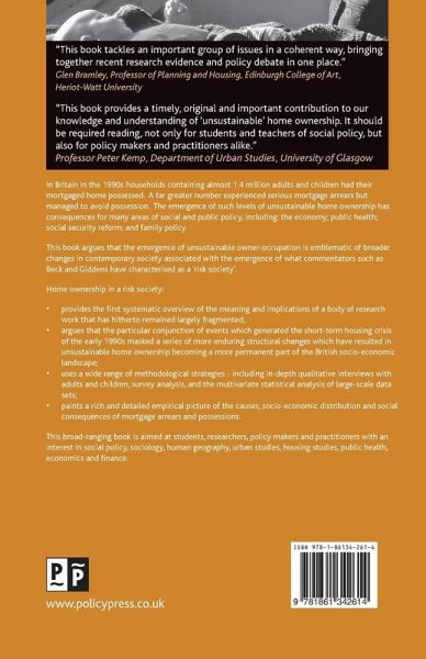 The emergence of high levels of unsustainable home ownership has many consequences for social and public policy. Using a wide range of methodological strategies, including in-depth qualitative interviews, this book paints a rich empirical picture of the causes, socio-economic distribution and social consequences of mortgage arrears and possessions.