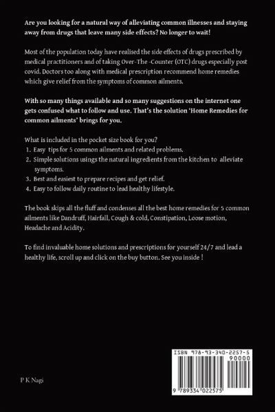 Are you looking for a natural way of alleviating common illnesses and staying away from drugs that leave many side effects? No longer to wait! Most of the population today have realised the side effects of drugs prescribed by medical practitioners and of taking Over-The -Counter (OTC) drugs especially post covid. Doctors too along with medical prescription recommend home remedies which give relief from the symptoms of common ailments. With so many things available and so many suggestions on the internet one gets confused what to follow and use. That's the solution 'Home Remedies for common ailments' brings for you. What is included in the pocket size book for you? Easy tips for 5 common ailments and related problems. Simple solutions usings the natural ingredients from the kitchen to alleviate symptoms. Best and easiest to prepare recipes and get relief. Easy to follow daily routine to lead healthy lifestyle The book skips all the fluff and condenses all the best home remedies for 5 common ailments like Dandruff, Hairfall, Cough & cold, Constipation, Loose motion, Headache and Acidity. To find invaluable home solutions and prescriptions for yourself 24/7 and lead a healthy life, scroll up and click on the buy button. See you inside!