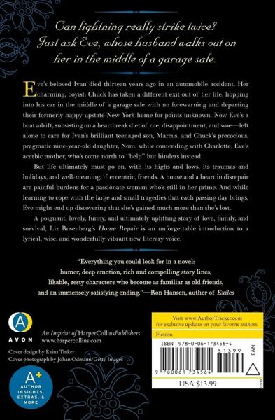Can lighting really strike twice? Just ask Eve, whose husband walks out on her in the middle of a garage sale. Eve's beloved Ivan died thirteen years ago in an automobile accident. Her charming, boyish Chuck has taken a different exit out of her life: hopping into his car in the middle of a garage sale with no forewarning and departing their formerly happy upstate New York home for points unknown. Now Eve's a boat adrift, subsisting on a heartbreak diet of rue, disappointment, and woe-left alone to care for Ivan's brilliant teenaged son, Marcus, and Chuck's precocious, pragmatic nine-year-old daughter, Noni, while contending with Charlotte, Eve's acerbic mother, who's come north to "help" but hinders instead. But life ultimately must go on, with its highs and lows, its traumas and holidays, and well-meaning, if eccentric, friends. A house and a heart in disrepair are painful burdens for a passionate woman who's still in her prime. And while learning to cope with the large and small tragedies that each passing day brings, Eve might end up discovering that she's gained much more than she's lost. A poignant, lovely, funny, and ultimately uplifting story of love, family, and survival, Liz Rosenberg's Home Repair is an unforgettable introduction to a lyrical, wise, and wonderfully vibrant new literary voice.