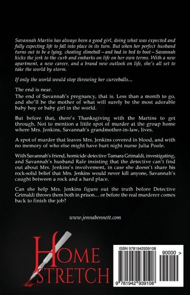 Savannah Martin has always been a good girl, doing what was expected and fully expecting life to fall into place in its turn. But when her perfect husband turns out to be a lying, cheating slimeball-and bad in bed to boot-Savannah kicks the jerk to the curb and embarks on life on her own terms. With a new apartment, a new career, and a brand new outlook on life, she's all set to take the world by storm. If only the world would stop throwing her curveballs... The end is near. The end of Savannah's pregnancy, that is. Less than a month to go, and she'll be the mother of what will surely be the most adorable baby boy or baby girl in the world. But before that, there's Thanksgiving with the Martins to get through. Not to mention a little spot of murder at the group home where Mrs. Jenkins, Savannah's grandmother-in-law, lives. A spot of murder that leaves Mrs. Jenkins covered in blood, and with no memory of who else might have hurt night nurse Julia Poole. With Savannah's friend, homicide detective Tamara Grimaldi, investigating, and Savannah's husband Rafe insisting that the detective can't find out about Mrs. Jenkins's involvement, in case she doesn't share his rock-solid belief that Mrs. Jenkins would never kill anyone, Savannah's caught between a rock and a hard place. Can she help Mrs. Jenkins figure out the truth before Detective Grimaldi throws them both in prison... or before the real murderer comes back to finish the job?