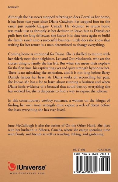 Although she has never stopped referring to Aces Corral as her home, it has been two years since Diana Crawford has stepped foot on the ranch just outside Calgary, Canada. Her decision to return home was made just as abruptly as her decision to leave, but as Diana's car pulls into the long driveway, she knows it is time once again to build the family ranch into a successful business. Little does she know that waiting for her return is a man determined to change everything. Coming home is emotional for Diana. She is thrilled to reunite with her elderly next-door neighbors, Len and Dot…mehr