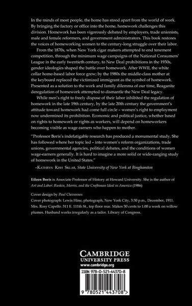 Abbreviations List of illustrations Acknowledgments Introduction 'home, sweet home': gender, the state, and labor standards Part I. Man's Freedom, Woman's Necessity: Jacobs and its Legacy: 1. 'A man's dwelling house is his castle': tenement house cigarmaking and the judicial imperative 2. 'White slaves of the cities': campaigns against sweated clothing 3. 'Women who work' and 'Women who spend': the family economy vs the family wage Part II. Visions and Voices: 4. 'Soldiers of freedom', 'garments of slavery': patriotic homework 5. 'To study their own conditions': states' rights to regulate 6. 'Homework is a community question' the worlds of the homeworker Part III. Engendering the New Deal: 7. 'To improve on business through law': homework under the NRA 8. 'Strike while the iron is hot': the politics of enactment, the perils of enforcement 9. 'Unknown to the common law': the fair labor standards act Part IV. Homework Redux: 10. 'With a keyboard in one hand': white collars in the home 11. Deregulating 'the rights of women' Index.