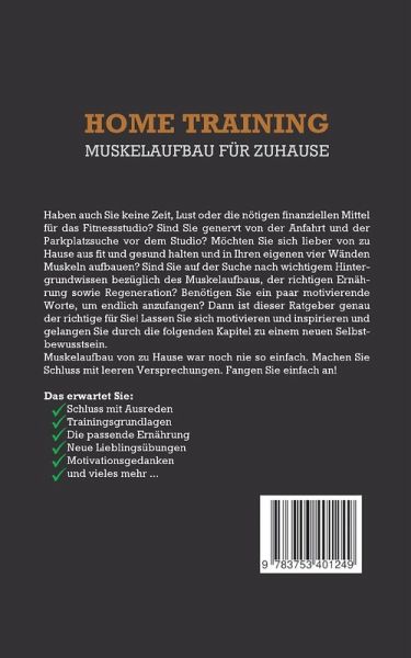 Haben auch Sie keine Zeit, Lust oder die nötigen finanziellen Mittel für das Fitnessstudio? Sind Sie genervt von der Anfahrt und der Parkplatzsuche vor dem Studio? Möchten Sie sich lieber von zu Hause aus fit und gesund halten und in Ihren eigenen vier Wänden Muskeln aufbauen? Sind Sie auf der Suche nach wichtigem Hintergrundwissen bezüglich des Muskelaufbaus, der richtigen Ernährung sowie Regeneration? Benötigen Sie ein paar motivierende Worte, um endlich anzufangen? Dann ist dieser Ratgeber genau der richtige für Sie! Lassen Sie sich motivieren und inspirieren und gelangen Sie durch die folgenden Kapitel zu einem neuen Selbstbewusstsein.Muskelaufbau von zu Hause war noch nie so einfach. Machen Sie Schluss mit leeren Versprechungen. Fangen Sie einfach an! Das erwartet Sie:-Schluss mit Ausreden-Trainingsgrundlagen-Die passende Ernährung-Neue Lieblingsübungen-Motivationsgedanken-und vieles mehr ...