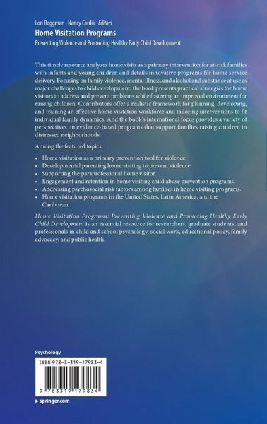 Part 1. Introduction to Home Visiting and its Challenges.- 1. Introduction: Home Visitation as a Primary Prevention Tool for Violence; Alberto Concha-Eastman.- 2. The Four Challenges for Home Visitation: Alcohol and Substance Abuse, Intrafamilial Violence, and Mental Disorders; Maristela G. Monteiro.- Part 2. Home Visiting Programs and Practices: Research and Evaluation.- 3. Home Visiting to Enhance Child Development in the Context of Violence: Possibilities and Limitations; Jon Korfmacher.- 4. Developmental Parenting Home Visiting to Prevent Violence: Monitoring and Evaluating; Lori Roggman.- 5. Developing the Home Visiting Workforce; Nick Wechsler.- 6. Supporting the Paraprofessional Home Visitor; Jon Kofmarcher.- 7. Engagement and Retention in Home Visiting Child Abuse Prevention Programs; William M. McGuigan and Breanna Gassner.- 8. Addressing Psychosocial Risk Factors among Families Enrolled in Home Visiting: Issues and Opportunities; S. Darius Tandon.- 9. Considerations on the Implementation, Innovation, and Improvement of Evidence-Based Home Visiting Programs; Mark S. Innocenti.- Part 3. Home Visiting Programs Outside the United States.- 10. Home Visitation Programs for Early Child Development: Experiences in Latin America and the Caribbean; Nancy Cardia, Renato Alves, Aline Gomes and Alder Mourão.- 11. Home Visiting Interventions to Promote Values that Support School Success; Martha Julia García-Sellers.- 12. The Roving Caregivers Programme: A Caribbean Model; Susan Branker, Clive Murray and Horis Lynch.- 13. The Investment In Home Visit Programs in Rural Indigenous Communities as a Strategy to Grant a Good Start in Life for Young Children; J. Leonardo Yánez.