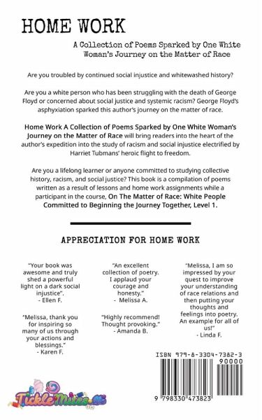 Are you troubled by continued social injustice and whitewashed history? Are you a white person who has been struggling with the death of George Floyd or concerned about social justice and systemic racism? George Floyd's asphyxiation sparked my journey on the matter of race. Home Work: A collection of Poems Sparked by One White Woman's Journey on the Matter of Race was the product related to lessons and assignments while participating in On The Matter of Race: White People Committed to Beginning the Journey Together, Level 1, September 2020 through February 2021.