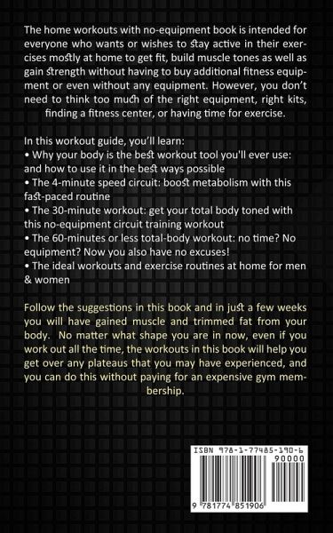 The home workouts with no-equipment book is intended for everyone who wants or wishes to stay active in their exercises mostly at home to get fit, build muscle tones as well as gain strength without having to buy additional fitness equipment or even without any equipment. However, you don't need to think too much of the right equipment, right kits, finding a fitness center, or having time for exercise. In this workout guide, you'll learn: ¿ Why your body is the best workout tool you'll ever use: and how to use it in the best ways possible ¿ The 4-minute speed circuit: boost metabolism with this fast-paced routine ¿ The 30-minute workout: get your total body toned with this no-equipment circuit training workout ¿ The 60-minutes or less total-body workout: no time? No equipment? Now you also have no excuses! ¿ The ideal workouts and exercise routines at home for men & women Follow the suggestions in this book and in just a few weeks you will have gained muscle and trimmed fat from your body. No matter what shape you are in now, even if you work out all the time, the workouts in this book will help you get over any plateaus that you may have experienced, and you can do this without paying for an expensive gym membership.