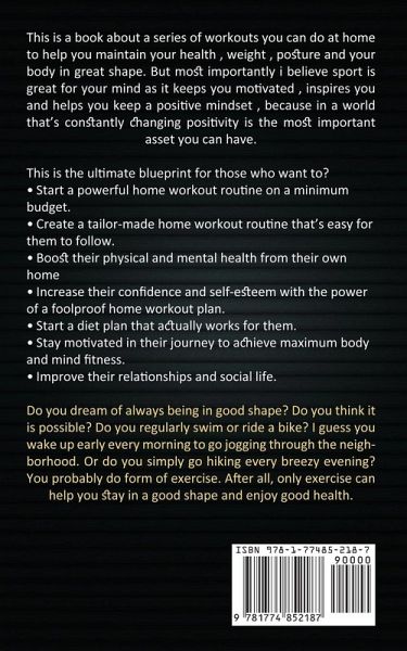 This is a book about a series of workouts you can do at home to help you maintain your health , weight , posture and your body in great shape. But most importantly i believe sport is great for your mind as it keeps you motivated , inspires you and helps you keep a positive mindset , because in a world that's constantly changing positivity is the most important asset you can have. This is the ultimate blueprint for those who want to? ¿ Start a powerful home workout routine on a minimum budget. ¿ Create a tailor-made home workout routine that's easy for them to follow. ¿ Boost their physical and mental health from their own home ¿ Increase their confidence and self-esteem with the power of a foolproof home workout plan. ¿ Start a diet plan that actually works for them. ¿ Stay motivated in their journey to achieve maximum body and mind fitness. ¿ Improve their relationships and social life. Do you dream of always being in good shape? Do you think it is possible? Do you regularly swim or ride a bike? I guess you wake up early every morning to go jogging through the neighborhood. Or do you simply go hiking every breezy evening? You probably do form of exercise. After all, only exercise can help you stay in a good shape and enjoy good health.
