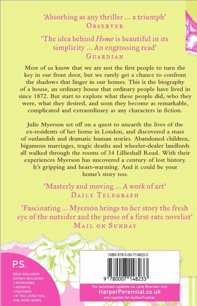 Ever thought about all the people who lived in your house before you? Julie Myerson did, and set out to learn as much as she could about their fascinating lives. This is the biography of a house, the history of a home. It's an ordinary house, an ordinary home, and ordinary people have lived there for over a century. But start to explore who they were, what they believed in, what they desired and they soon become as remarkable, as complicated and as fascinating as anyone. That is exactly what Julie Myerson set out to do. She lives in a typical Victorian terraced family house, of average size, in a typical Victorian suburb (Clapham) and she loves it. She wanted to find out how much those who preceded her loved living there, so she spent hours and hours in the archives at the Family Record Office, the Public Record Office at Kew, local council archives and libraries across the country. Like an archaeologist, she found herself blowing the dust off files that no-one had touched since the last sheet of paper in them was typed. As she scraped the years away, underneath she found herself embroiled in a detective hunt as, bit by bit, she started to piece together the story of her house, built in 1877, as told by its former occupants in their own words and deeds. And so she met the bigamist, the Tottenham Hotspur fanatic, the Royal servant, the Jamaican family and all the rest of the eccentric and entertaining former occupants of 34 Lillieshall Road. The book uncovers a lost 130-year history of happiness and grief, change and prudence, poverty and affluence, social upheaval and technological advance. Most of us are dimly aware that we are not the first person to turn a key in our front door lock, yet we rarely confront the shadows that inhabit our homes. But once you do - and Julie Myerson shows you how - you will never bear to part from their company again. This is your home's story too.