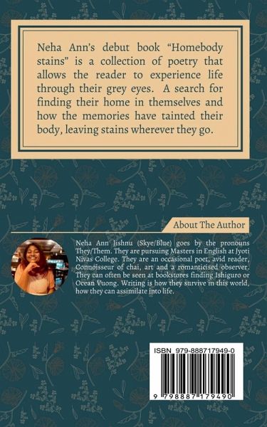 Neha Ann's debut book "Homebody stains" is a collection of poetry that allows the reader to experience life through their grey eyes. A search for finding their home in themselves and how the memories have tainted their body leaving stains wherever they go. To see more content through their eyes, @griefwithbenefits
