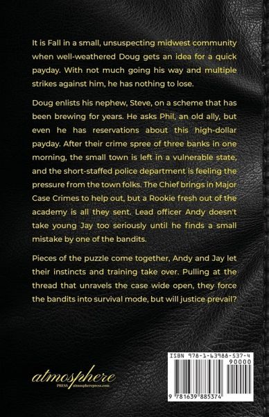 It is Fall in a small, unsuspecting midwest community when well-weathered Doug gets an idea for a quick payday. With not much going his way and multiple strikes against him, he has nothing to lose. Doug enlists his nephew, Steve, on a scheme that has been brewing for years. He asks Phil, an old ally, but even he has reservations about this high-dollar payday. After their crime spree of three banks in one morning, the small town is left in a vulnerable state, and the short-staffed police department is feeling the pressure from the town folks. The Chief brings in Major Cases Crimes to help out, but a Rookie fresh out of the academy is all they sent. Lead officer Andy doesn't take young Jay too seriously until he finds a small mistake by one of the bandits. Pieces of the puzzle come together, and Andy and Jay let their instincts and training take over. Pulling at the thread that unravels the case wide open, they force the bandits into survival mode, but will justice prevail?