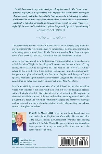 The Homecoming Seasons: An Irish Catholic Returns to a Changing Long Island is a deeply moving memoir of a returning native's re-experience of his childhood community. After many years abroad as a graduate student at Cambridge, a Peace Corps Volunteer in Thailand, and as a country program director of health care and agricultural programs in central Africa, James MacGuire returned to New York and spent most of the 1980s at Time Inc., Macmillan and the Manhattan Institute. In 1990 he married and several years later, with a second child on the way, he and his wife decamped from Manhattan for a small enclave called the Isle of Wight in the village of Lawrence on the south shore of Long Island, where MacGuire had grown up. This book tells the story of MacGuire's return to this world-how it had evolved from ancient times; been inhabited by indigenous peoples; colonized by the Dutch and English; and then grew from a sparsely populated agricultural corner of western Long Island to an early summer resort, then an outer, and, finally, an inner suburb of New York City. Jamie MacGuire skillfully weaves memories of his childhood in this almost hidden world with sketches of his family and their friends before updating his account with a lovingly detailed, diary-like depiction of returning. His parents' friends now much older, the community more diverse, as he, his wife and children make new friends as they proceed into this changed world. He captures in cinematic detail the wonder of the wetlands and surrounding natural world, the poignant life, death and rebirth of community, the joys and sorrows of marriage and parenthood, and the profound exultation of safely shepherding two beloved sons to triumphant adulthood. This is an uplifting literary memoir that will earn and deserve the widest possible audience.