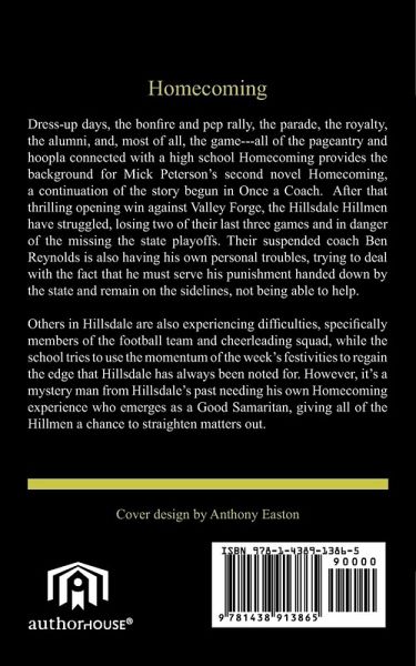 Homecoming Dress-up days, the bonfire and pep rally, the parade, the royalty, the alumni, and, most of all, the game---all of the pageantry and hoopla connected with a high school Homecoming provides the background for Mick Peterson's second novel Homecoming, a continuation of the story begun in Once a Coach. After that thrilling opening win against Valley Forge, the Hillsdale Hillmen have struggled, losing two of their last three games and in danger of the missing the state playoffs. Their suspended coach Ben Reynolds is also having his own personal troubles, trying to deal with the fact that he must serve his punishment handed down by the state and remain on the sidelines, not being able to help. Others in Hillsdale are also experiencing difficulties, specifically members of the football team and cheerleading squad, while the school tries to use the momentum of the week's festivities to regain the edge that Hillsdale has always been noted for. However, it's a mystery man from Hillsdale's past needing his own Homecoming experience who emerges as a Good Samaritan, giving all of the Hillmen a chance to straighten matters out. Cover design by Anthony Easton