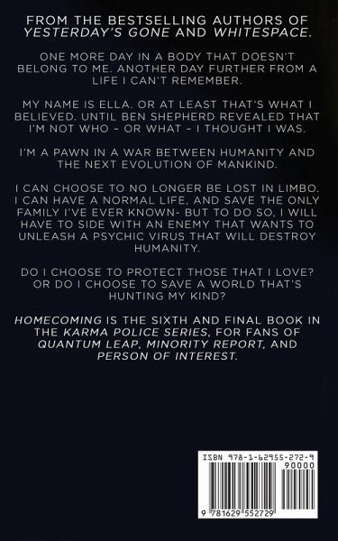 From the bestselling authors of Yesterday's Gone and WhiteSpace. One more day in a body that doesn't belong to me. Another day further from a life I can't remember. My name is Ella. Or at least that's what I believed. Until Ben Shepherd revealed that I'm not who - or WHAT - I thought I was. I'm a pawn in a war between humanity and the next evolution of mankind. I can choose to no longer be lost in limbo. I can have a normal life, and save the only family I've ever known- but to do so, I will have to side with an enemy that wants to unleash a psychic virus that will destroy humanity. Do I choose to protect those that I love? Or do I choose to save a world that's hunting my kind? Homecoming is the sixth and final book in the Karma Police series, for fans of Quantum Leap, Minority Report, and Person of Interest.