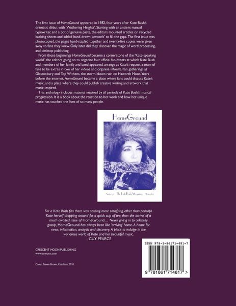 HOMEGROUND: THE KATE BUSH MAGAZINE: ANTHOLOGY TWO: 'THE RED SHOES' TO '50 WORDS FOR SNOW' ¿HomeGround is a magazine devoted to Kate Bush (born in 1958), a British pop star best-known for hits such as 'Wuthering Heights', 'Wow', 'Hounds of Love' and 'Running Up That Hill'. This book is pure heaven for music fans. The HomeGround magazine anthology includes material inspired by all periods of Kate Bush's musical progression. It is a book about the reaction to her work and how her unique music has touched the lives of so many people. This is a unique book, a labour of love for hundreds of music fans who have contributed to HomeGround over its thirty-year existence. The book includes an enormous amount of information about Kate Bush, accounts of every release, album, single, pop promo and appearance, as well as memories and accounts of music fandom (such as conventions, meetings, hikes, stage door encounters and video parties). It also includes material on many other pop acts and events. It features poetry, stories, letters, reviews, interviews, memoirs, cartoons, drawings, paintings and photographs. This is the second book of a two volume set, totalling over 1200 pages. The second volume covers Kate Bush's career from 'The Red Shoes' album to '50 Words For Snow' album (from the early 1990s to the present day). The first book runs from the origins of Bush's career to the album 'The Sensual World'. The first issue of HomeGround appeared in 1982, four years after Kate Bush's dramatic debut with 'Wuthering Heights'. Starting with an ancient manual typewriter, and a pot of glue paste, the editors mounted articles on recycled backing sheets and added hand-drawn artwork to fill the gaps. The first issue was photocopied, the pages hand-stapled together and twenty-five copies were given away to fans they knew. Only later did they discover the magic of word processing, and desktop publishing. From those beginnings HomeGround became a cornerstone of the 'Kate-speaking world', the editors going on to organise four official fan events at which Kate Bush and members of her family and band appeared, arrange at Bush's request a team of fans to be extras in two of her videos and organise informal fan gatherings at Glastonbury and Top Withens, the storm-blown ruin on Haworth Moor. Years before the internet, HomeGround became a place where fans could discuss Bush's music, and a place where they could publish creative writing and artwork that music inspired. www.crmoon.com. Buy direct from Crescent Moon (at crmoon.com): we are cheaper than online sellers (including Amazon), and more of your money goes to the people who produced these amazing books. We also have offers on buying both books together. Fully illustrated with hundreds of images, including rare photographs and original artwork. Includes a timeline of Kate Bush's career, index, and a who's who. ISBN 9781861714817. 568pp. Volume One of HomeGround, covering Kate Bush's early career, is also available: ISBN 9781861714794 (Pbk) and 9781861714800 (Hbk). Also available in hardback: ISBN 9781861714824. Katebushnews.com - the website of HomeGround, the international Kate Bush magazine.